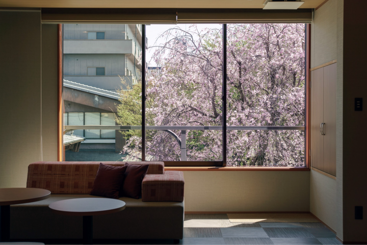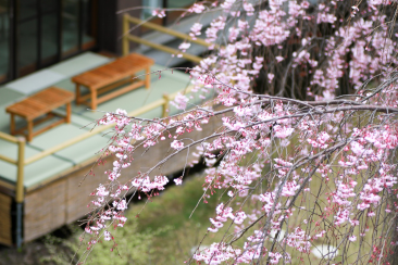 毎年3月末頃になると可憐な薄紅色の花を咲かせ、館内を春色に彩ります。満開時には、中庭を囲む山ざくら客室の窓からしだれ桜越しにお花見を楽しむこともでき、宿にいながらにしてプライベート花見を満喫できます(実際に「客室から中庭の桜が見えて感動した」との声もあります。