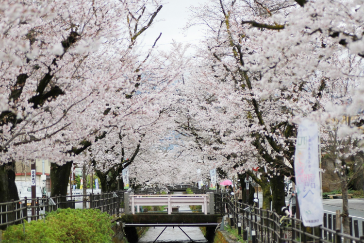 石和温泉に来たらまず訪れたいのが、温泉街を象徴する「さくら温泉通り」です。石和温泉駅から徒歩15分ほどの近津川沿いに、約170本ものソメイヨシノが東西約1kmにわたって植えられた桜並木が続きます。