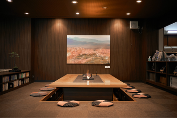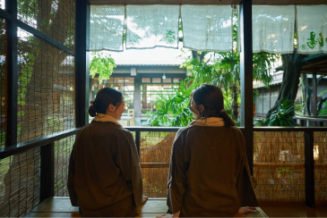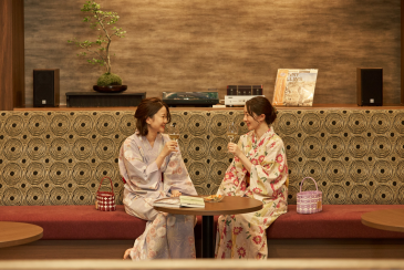 湯上がりには、館内ラウンジ「山のおはなし」へ。季節の移ろいを映す中庭を眺めながら、無料サービスのドリンクで喉を潤しましょう。