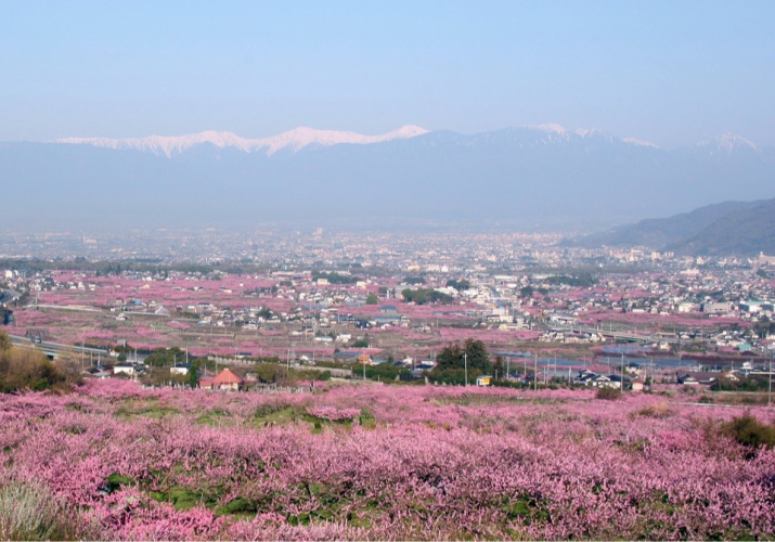 石和温泉で桜を楽しんだら、ぜひ桃の花の絶景にも足を延ばしてみましょう。笛吹市は桃の生産量日本一を誇り、市内には約30万本もの桃の木が植えられています。